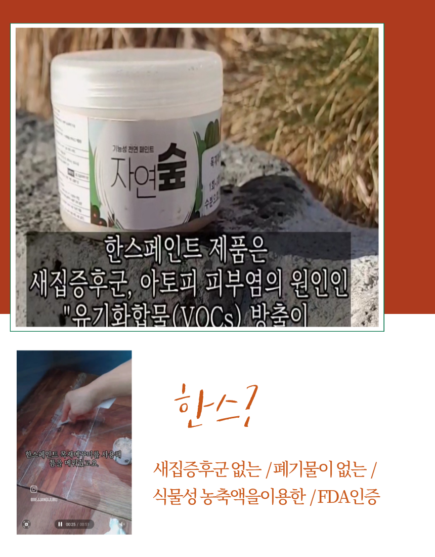 이제품은 목재와 유사한성질로 만들어 수축되어 삐져나오거나 하지 않고 목재와 잘 어우러지도록 제조하였습니다.